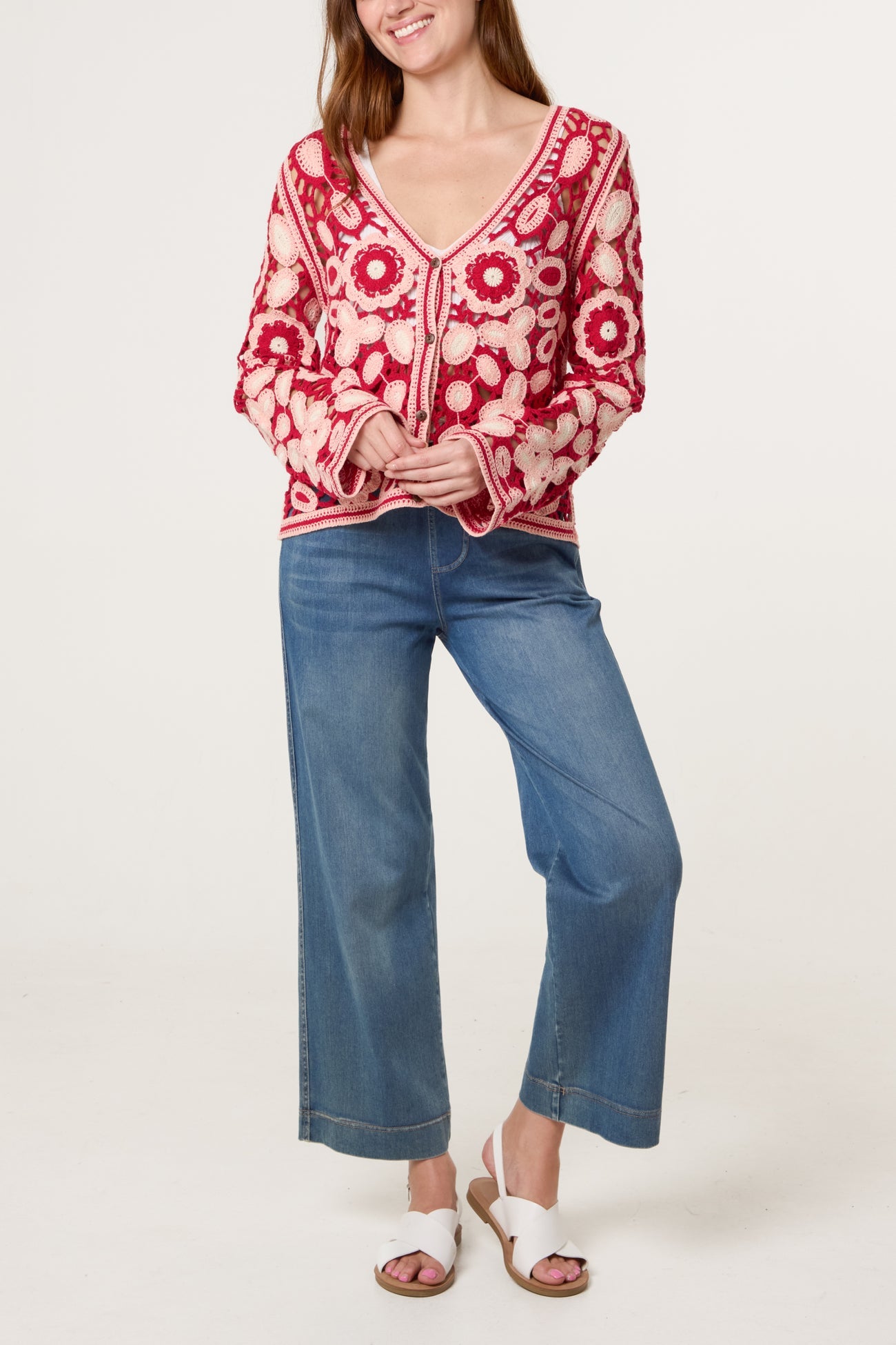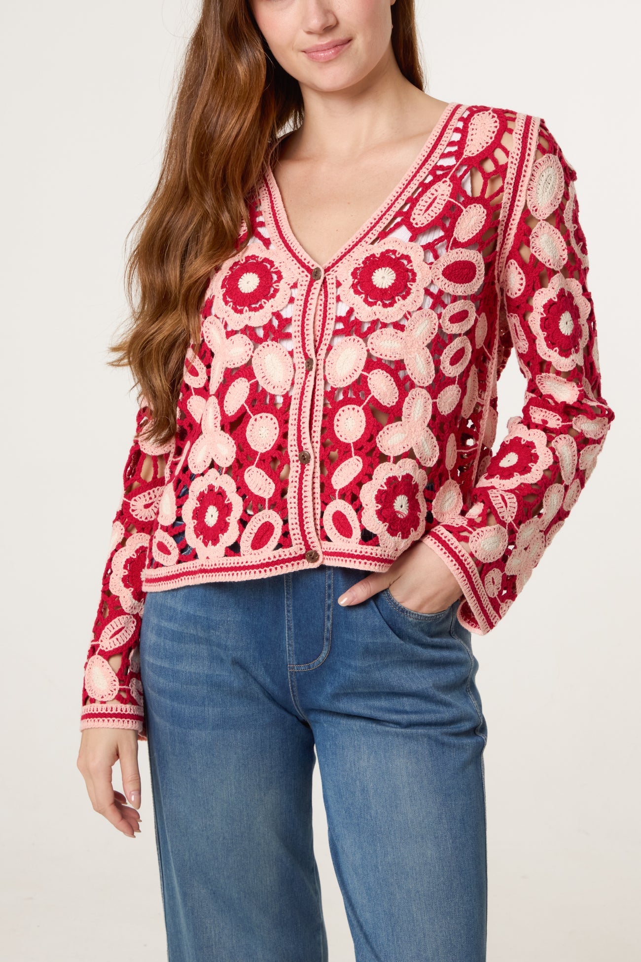 Super cute crochet cardigan with a V-neck, front button fastening and fluted scalloped sleeves.
