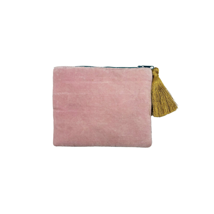 It complements both a traditional and modern look with a quirky colour palette. This versitile, glam accessory has ample room for all your essentials. It is carefully embellished with gold beads and stitching , finished with a contrast geometric embroidered trim. It has a powder pink velvet on the reverse.