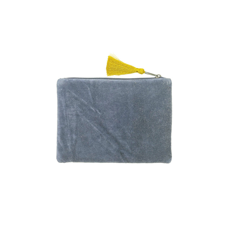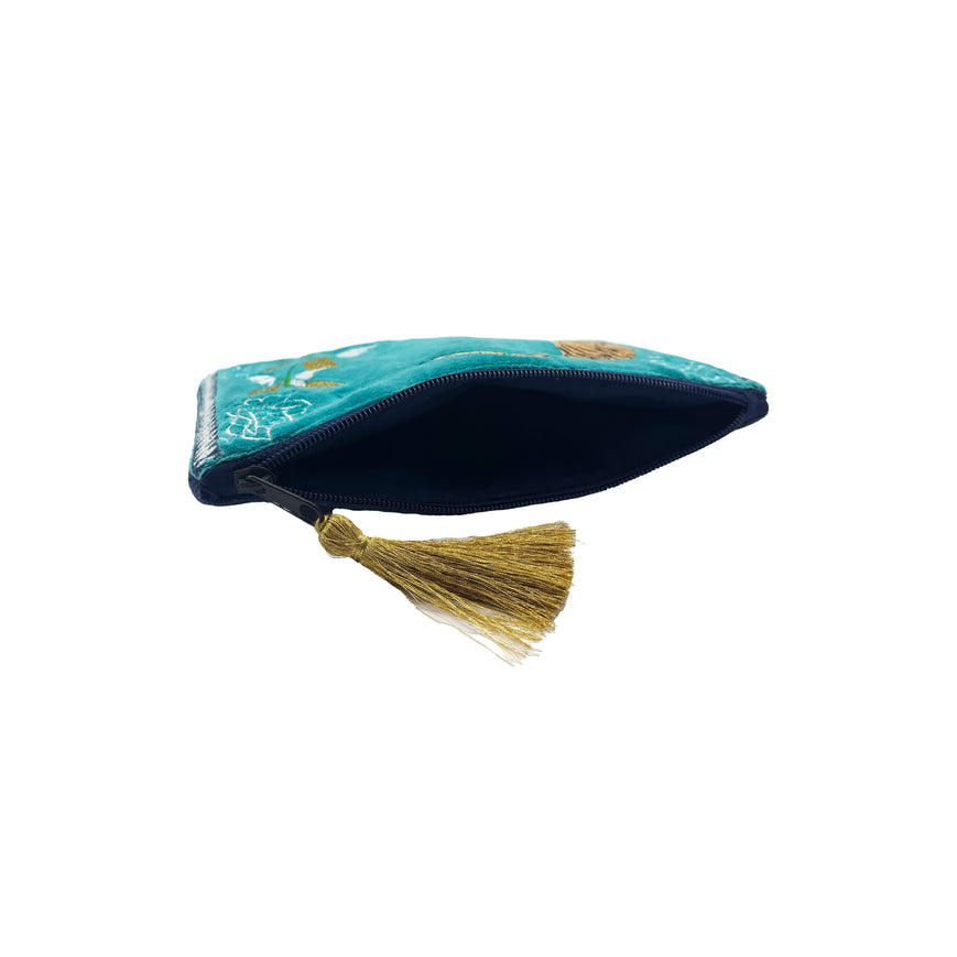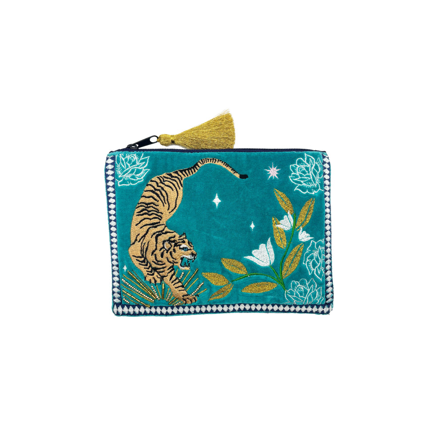 A luxe teal velvet embroidered pouch from House of Disaster, featuring a traditional tattoo inspired embroidered tiger with a gold sunburst and floral details. It compliments both a traditional and modern look with a quirky colour palette. This versatile, glam accessory has ample room for all your essentials. It is carefully embellished with gold beads and stitching , finished with a contrast geometric embroidered border.