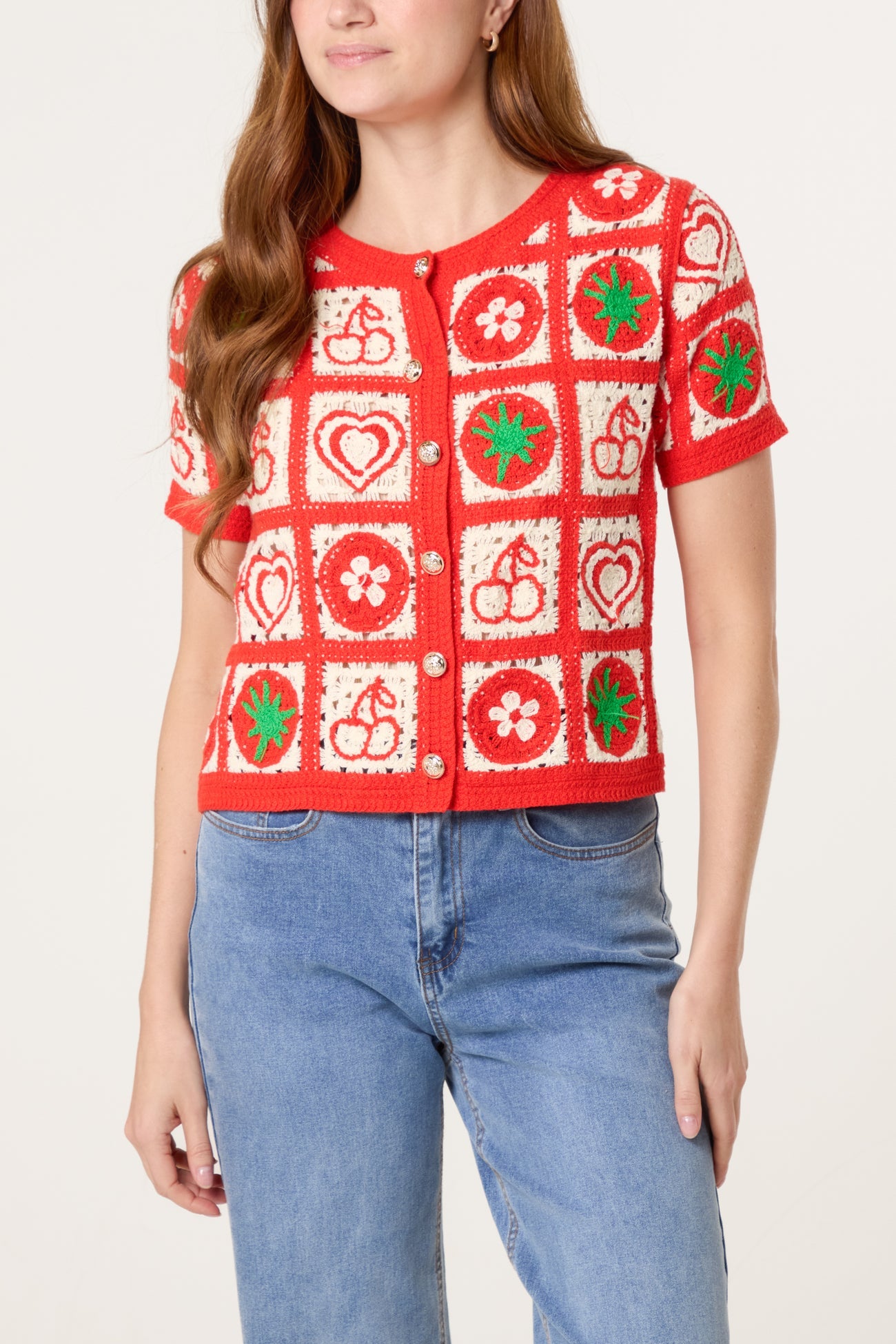 Super cute round neck crochet cardigan, with front button fastening and short sleeves.